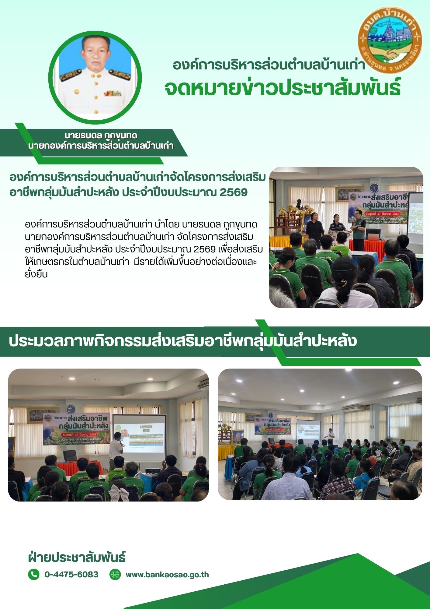 วันที่ 27 มีนาคม 2569 องค์การบริหารส่วนตำบลบ้านเก่า นำโดย นายธนดล กูกขุนทดนายกองค์การบริหารส่วนตำบลบ้านเก่า จัดโครงการส่งเสริมอาชีพกลุ่มมันสำปะหลัง ประจำปีงบประมาณ 2569 เพื่อส่งเสริมให้เกษตรกรในตำบลบ้านเก่า มีรายได้เพิ่มขึ้นอย่างต่อเนื่องและ ยั่งยืน