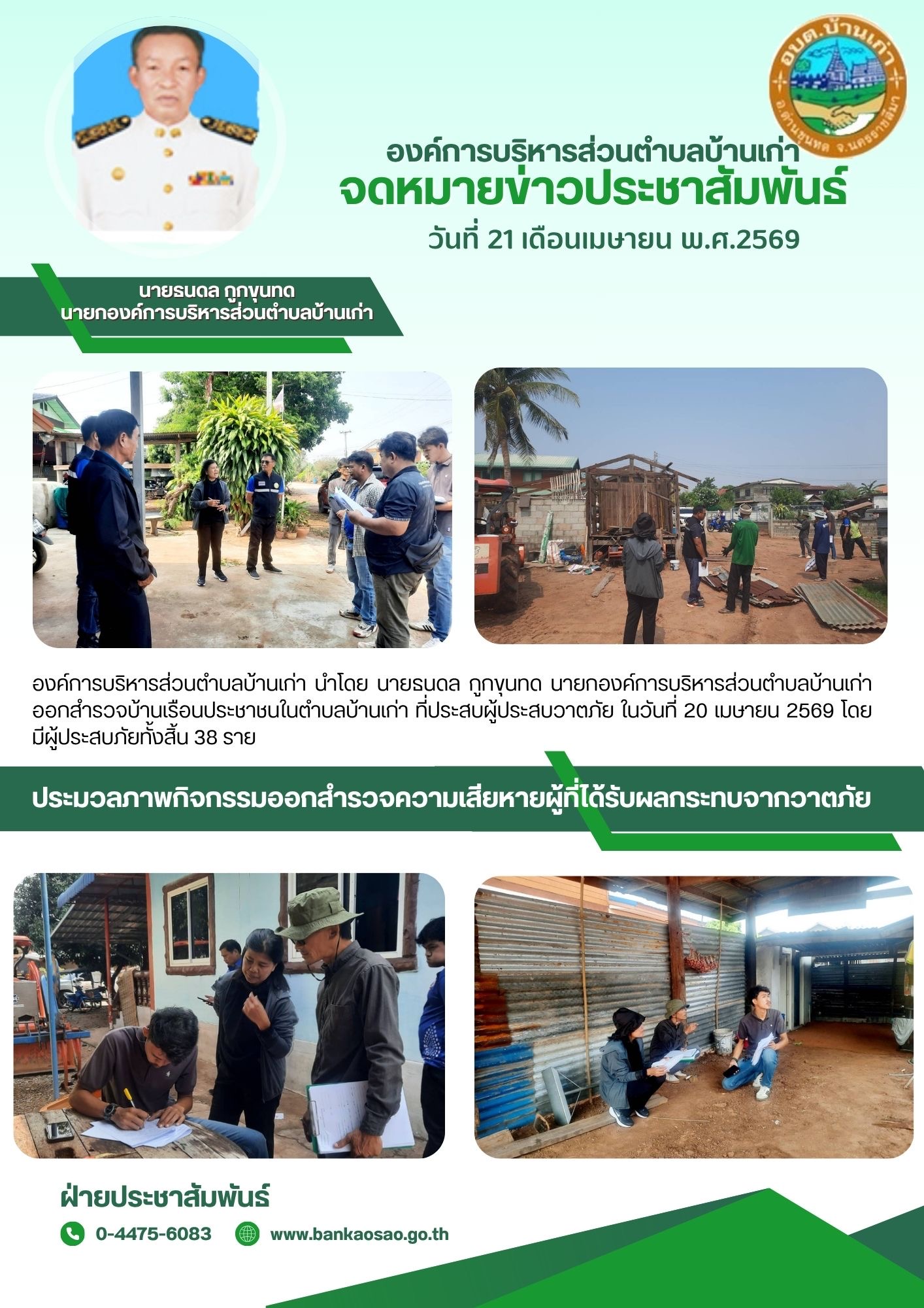 วันที่ 21 เมษยน 2569 องค์การบริหารส่วนตำบลบ้านเก่า นำโดย นายธนดล กูกขุนทด นายกองค์การบริหารส่วนตำบลบ้านเก่า ได้ออกสำรวจบ้านเรือนประชาชนในเขตพื้นที่ตำบลบ้านเก่า ผู้ที่ประสบวาตภัยในวันที่ 20 เมษายน 2569 โดยมีผู้ประสบภัยทั้งสิ้น 38 ราย