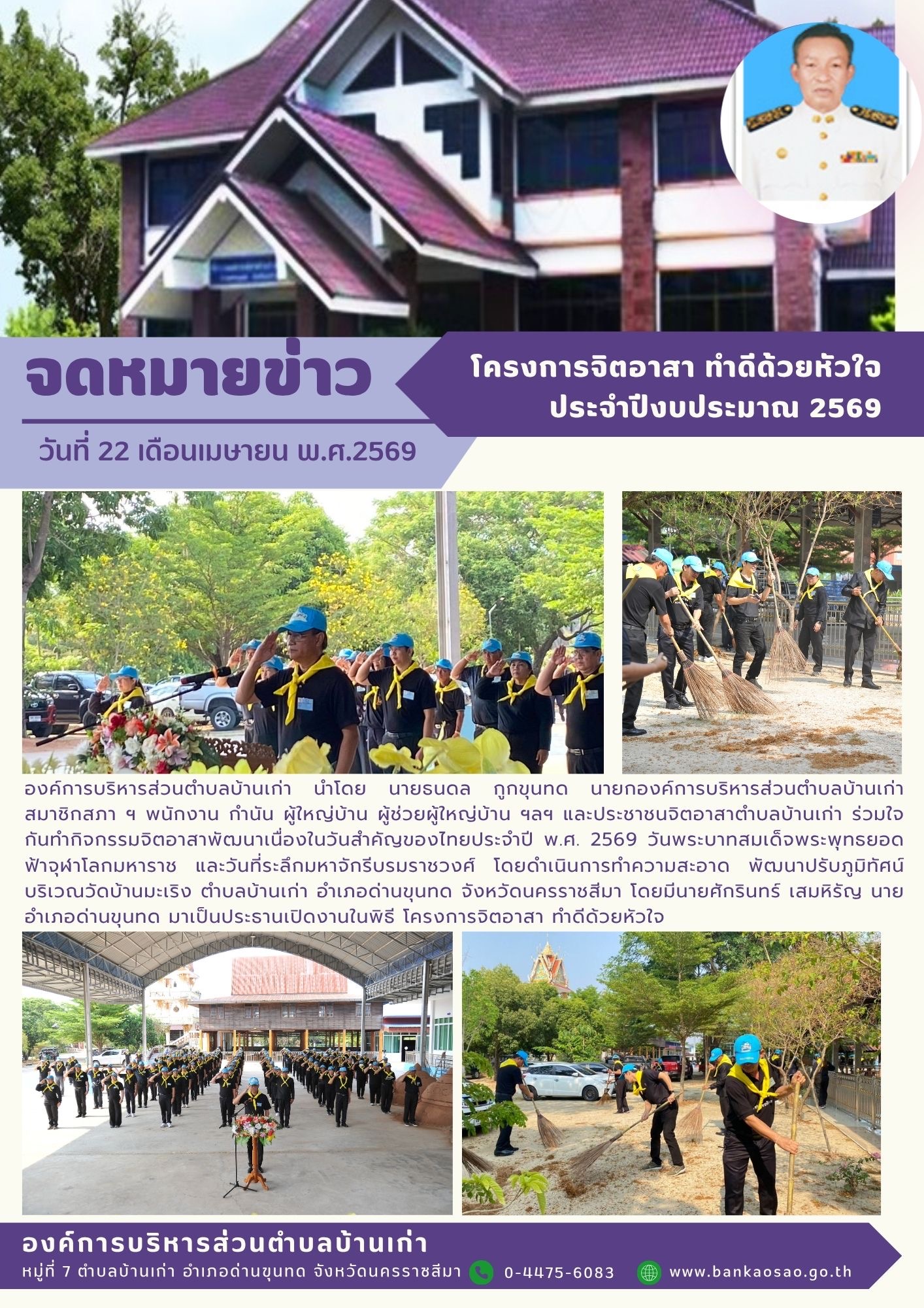 องค์การบริหารส่วนตำบลบ้านเก่า นำโดย นายธนดล กูกขุนทด นายกองค์การบริหารส่วนตำบลบ้านเก่า สมาชิกสภา ฯ พนักงาน กำนัน ผู้ใหญ่บ้าน ผู้ช่วยผู้ใหญ่บ้าน ฯลฯ และประชาชนจิตอาสาตำบลบ้านเก่า ร่วมใจกันทำกิจกรรมจิตอาสาพัฒนาเนื่องในวันสำคัญของไทยประจำปี พ.ศ. 2569 วันพระบาทสมเด็จพระพุทธยอดฟ้าจุฬาโลกมหาราช และวันที่ระลึกมหาจักรีบรมราชวงศ์ โดยดำเนินการทำความสะอาด พัฒนาปรับภูมิทัศน์บริเวณวัดบ้านมะเริง ตำบลบ้านเก่า อำเภอด่านขุนทด จังหวัดนครราชสีมา โดยมีนายศักรินทร์ เสมหิรัญ นายอำเภอด่านขุนทด มาเป็นประธานเปิดงานในพิธี โครงการจิตอาสา ทำดีด้วยหัวใจ